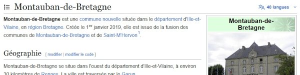 Sur Wikipédia Montauban-de-Bretagne est une commune nouvelle située dans le département d’Ille-et-Vilaine, en région Bretagne. Créée le 1er janvier 2019, elle est issue de la fusion des communes de Montauban-de-Bretagne et de Saint-M’Hervon. Elle se situe dans l’ouest du département, à environ 30 kilomètres de Rennes. La ville est traversée par le Garun… ► Rennes 🛈