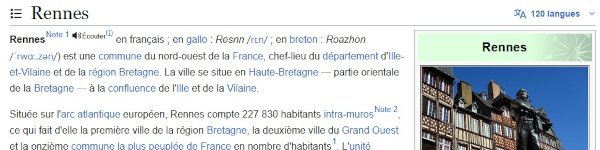Sur Wikipédia Rennes (en gallo : Resnn, en breton : Roazhon) est une commune du nord-ouest de la France, chef-lieu du département d’Ille-et-Vilaine et de la région Bretagne. La ville se situe en Haute-Bretagne — partie orientale de la Bretagne — à la confluence de l’Ille et de la Vilaine… |